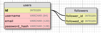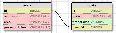 user表: username,email和password_hash字段被定义为字符串(数据库术语中的VARCHAR),并指定其最大长度,以便数据库可以优化空间使用率。 username和email字段的用途不言而喻,password_hash字段值得提一下。 我想确保我正在构建的应用采用安全最佳实践,因此我不会将用户密码明文存储在数据库中。 明文存储密码的问题是,如果数据库被攻破,攻击者就会获得密码,这对用户隐私来说可能是毁灭性的。 如果使用哈希密码,这就大大提高了安全性。 这将是另一章的主题,所以现在不需分心。