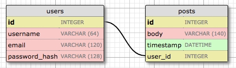 post表: 将具有必须的id、用户动态的body和timestamp字段。 除了这些预期的字段之外,我还添加了一个user_id字段,将该用户动态链接到其作者。 你已经看到所有用户都有一个唯一的id主键, 将用户动态链接到其作者的方法是添加对用户id的引用,这正是user_id字段所在的位置。 这个user_id字段被称为外键。 上面的数据库图显示了外键作为该字段和它引用的表的id字段之间的链接。 这种关系被称为一对多,因为“一个”用户写了“多”条动态。